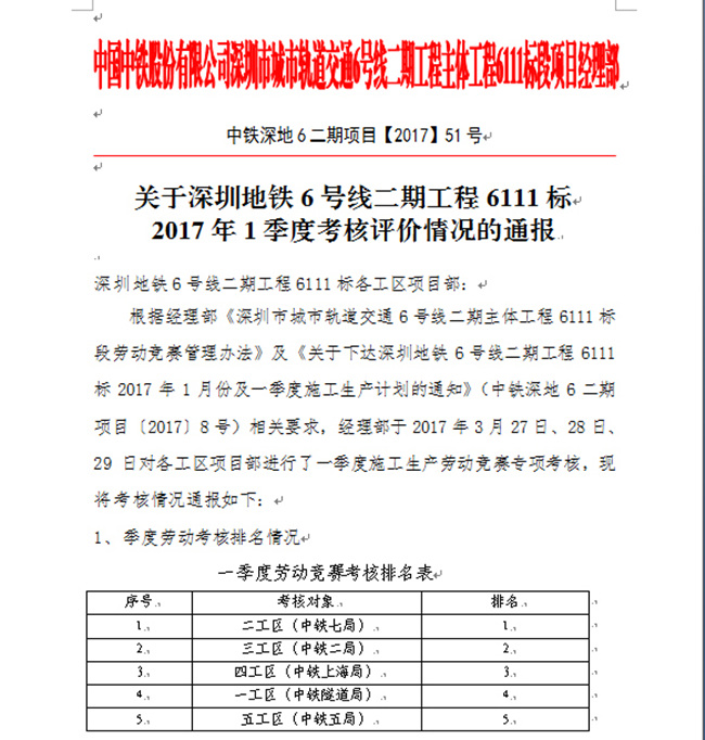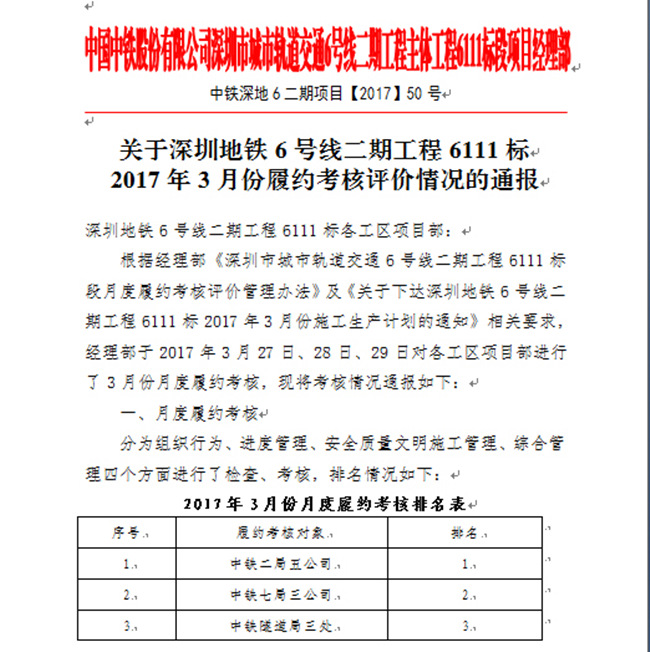 (通讯员 何伟)4月10日,中国中铁建设投资集团有限公司通报了2017年3月份履约考核评价和2017年一季度履约考核评价结果,深圳地铁6号线项目在全线7家施工单位考核中分别取得第一名和第二名,并获奖励7.9万元。