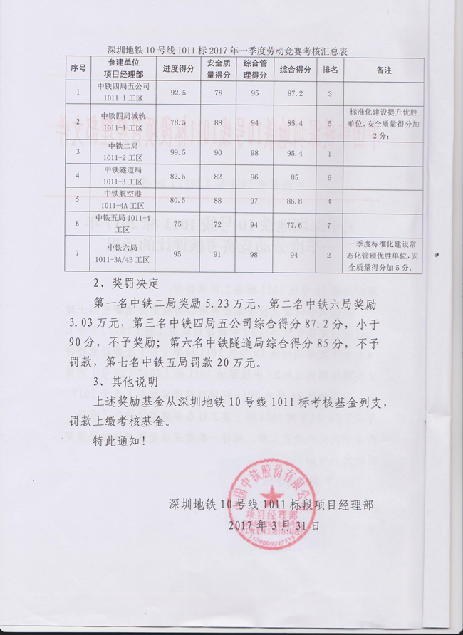 (通讯员 王素华)4月14日,中国中铁建设投资集团通报了2017年深圳地铁10号线一季度劳动竞赛考核结果,深圳地铁10号线项目在全线7家参评单位劳动竞赛考核中排名第一,并获奖励5.23万元。同时公布的2017年一季度工期目标及节点工期考核情况通报,深圳地铁10号线项目提前14天完成节点目标,并获奖励5万元。