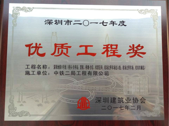 (通讯员 何伟)近日,公司深圳地铁11号线11307标机场北停车场项目荣获深圳市建筑业协会2017年度 “优质工程奖”。