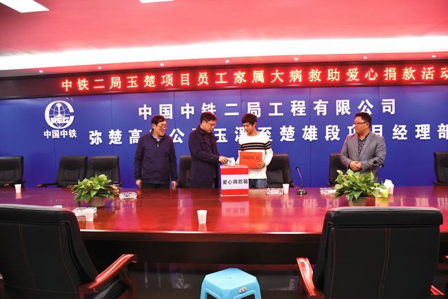 (通讯员 张新军 唐天文)近日,中铁二局五公司玉楚高速项目部党政工团牵头,号召经理部全体员工、施工班组伸出援助之手,奉献关爱之心,对一位见习生住院的亲人慷慨解囊、捐款相助。